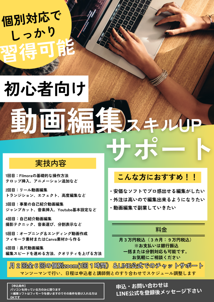 フィモーラの動画編集ソフトを使って初心者を対象とした基礎的な編集の仕方をマンツーマンで3カ月かけて動画編集出来るようにしっかりサポートします。